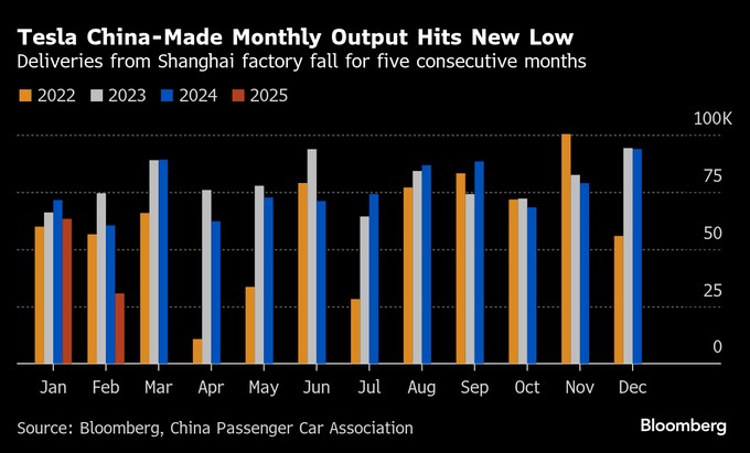 中国の全国乗用車市場情報連合会(乗連会)のデータによると、イーロン・マスク氏率いる同社の中国販売台数は、ここ5カ月連続で前年同月比で減少している。2月の出荷台数は前年同月比49%減の3万688台と、新型コロナウイルス禍のさなかに月間ベースで過去最低を記録した2022年7月(2万8217台)以来の低水準に落ち込んだ。