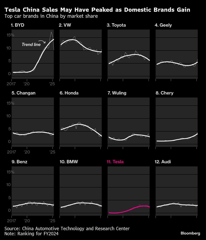 (ブルームバーグ):電気自動車(EV)について考えるときに大半の人が思い浮かべる米テスラは、世界最大かつ最先端のEV市場である中国では既にピークを過ぎたのかもしれない。