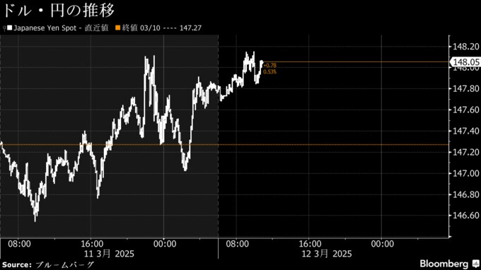 (ブルームバーグ):12日の東京外国為替市場の円相場は1ドル=148円台に下落。米国の景気懸念が和らいだことやウクライナ情勢の改善期待を背景にリスク選好の円売りがやや優勢だ。一方、2025年春闘の賃上げ集中回答が注目されており、日本銀行の追加利上げ観測を強める内容なら円を支えるとの見方もある。