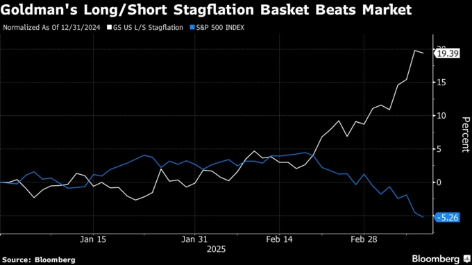 (ブルームバーグ):トランプ米大統領の行きつ戻りつする関税戦争に端を発した米国株急落が3週目に入り、避難先となるような勝利戦略はほとんど見当たらない。しかし、今まさに成功している戦略がある。スタグフレーションに陥る経済の中で成長する銘柄に賭ける取引だ。