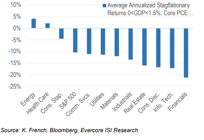 スタグフレーションのシナリオにおける勝者は誰か。一般的に、景気がどんなに低迷していても安定したキャッシュフローを生み出す企業がこれに該当する。ヘルスケアやエネルギー、生活必需品といったディフェンシブセクターは、S&P500種構成銘柄の中で25年のトップクラスのパフォーマンスを残している。