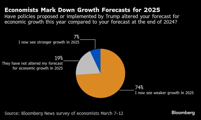 米金融当局者は、とりわけ関税などトランプ大統領の経済政策を巡る不透明感から、当面金利を据え置く考えを示唆している。今回の調査によると、トランプ氏の政策(計画・実施分を含む)により、大半のエコノミストが成長見通しを引き下げる一方で、インフレ見通しを引き上げた。