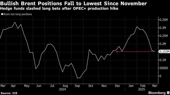米国産の値下がりを見込むポジションを縮小した一方、北海ブレントに対する弱気な姿勢は維持している。トランプ大統領の貿易戦争を背景に米国内は供給不足が懸念されるが、欧州の原油指標には産油国の増産見通しが影響する。