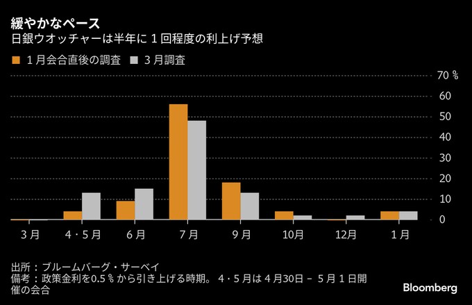 ブルームバーグが4-10日に実施したエコノミスト調査では、今週会合での追加利上げ予想はゼロだった。利上げのタイミングは7月の48%が最多で、次いで6月が15%、5月と9月が13%。一部で時期を前倒しする動きはあるものの、引き続き半年に1回程度の利上げペースが想定されている。