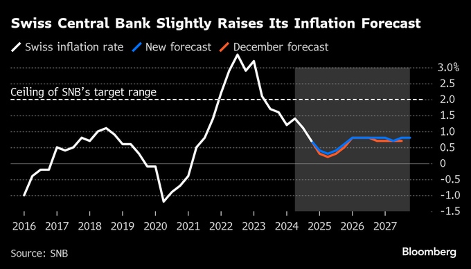 フラン高抑制定は、通貨高による輸入物価とインフレの低下を防ぐことを目的としている。消費者物価上昇率は2月にほぼゼロに達した。