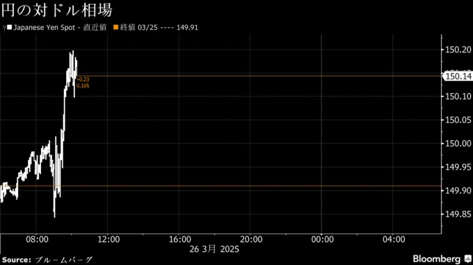 (ブルームバーグ):26日の東京外国為替市場の円相場は1ドル=150円台前半に下落。日本株相場が続伸し、リスク志向の強まりを背景に円売り・ドル買いが優勢だ。