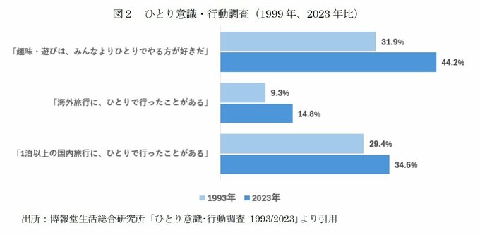 冒頭で紹介した同所の「ひとり意識・行動調査」を見ると、「趣味・遊びは、みんなよりひとりでやる方が好きだ」は44.2%(93年:31.9%)、「海外旅行に、ひとりで行ったことがある」は14.8%(93年:9.3%)、「1泊以上の国内旅行に、ひとりで行ったことがある」は34.6%(93年:29.4%)と、一人で趣味や旅行することへの抵抗感が下がっていることがわかる。