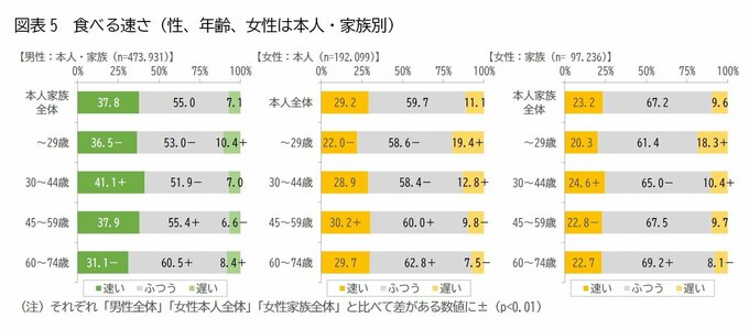男性では「速い」の割合が全体と比べて高いのは30~44歳、「遅い」の割合が高いのは29歳以下と60~74歳だった。職場でも家庭でも忙しい頃に速い傾向がありそうだ。この年代は、生活習慣病のリスクが高い年代でもある。