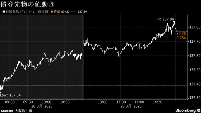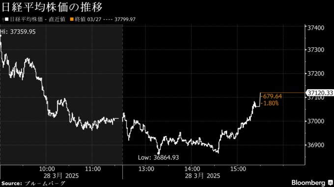 (ブルームバーグ):28日の日本市場では株式が大幅下落し、日経平均株価は2週間ぶりの安値で終えた。トランプ米大統領の自動車関税を受けて投資家心理が悪化。リスク回避で安全資産とされる債券は買われ、為替は円が1ドル=150円台後半に上昇した。