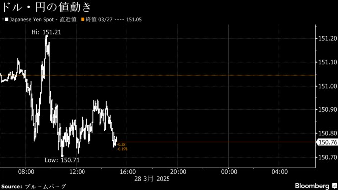 一方、金融機関が外為取引の基準レートとする公示仲値の設定に向けては実需のドル買いが強まり、円はほぼ4週間ぶりの安値を更新する場面もあった。