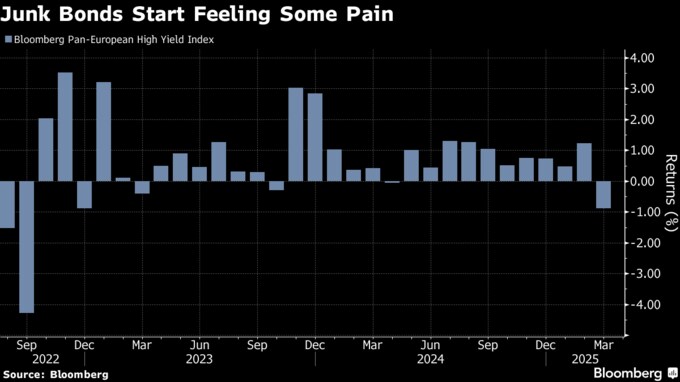 ここ数週間は、世界的な株安とともにハイイールド債も売られ始めた。3月にはハイイールド債のリターンが、欧州では22年9月以来、米国では23年10月以来の最悪となった。