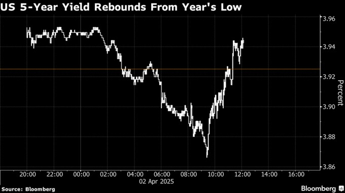 米国債利回りは米東部時間正午までに上昇に転じた。5年債利回りは朝方には一時3.87%と、昨年10月以来の低水準を付けていた。トランプ大統領が同日発表する新たな関税措置が景気に打撃を及ぼすとの見方が広がった。