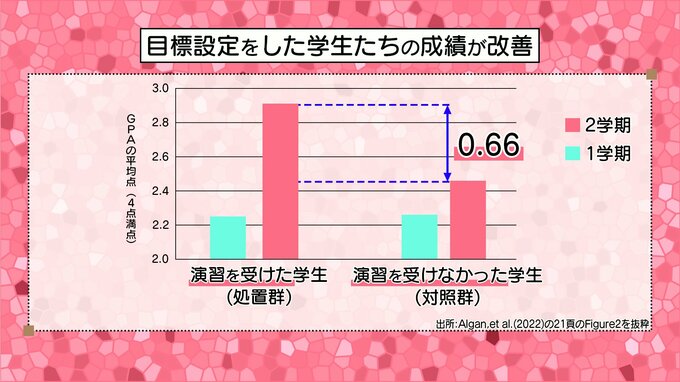 「この研究では、大学生に2時間くらいかけて詳細な目標設定をさせました。その結果、たった1学期間で成績が大幅に向上しました」