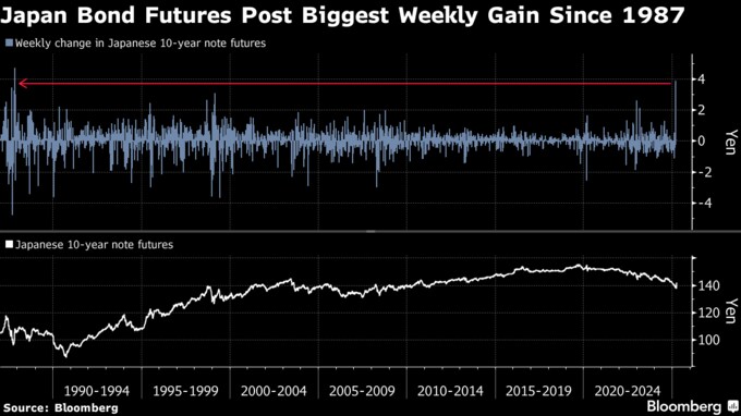 国債先物は今週4円近く急騰、週間の上昇幅としては1987年以来の大きさとなった。トランプ米大統領の相互関税で日本が他の多くの国よりも高い関税を課される見通しとなり、10年国債利回りは4日に20ベーシスポイント(bp、1bp=0.01%)急低下した。