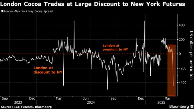 ロンドン市場のカカオ豆先物5月限は3日、ニューヨーク市場の先物をトン当たり500ドル(約7万3000円)余り下回った。関税によって米国の供給コストは他地域よりも高くなり、米チョコメーカーに打撃を与える可能性がある。供給不足を背景にカカオ豆先物は昨年12月に過去最高値を更新しており、チョコメーカーは既に苦しい状況にある。
