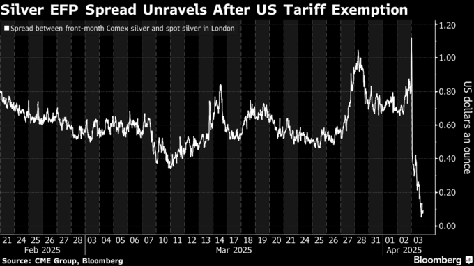 3日の米市場では、そうした貴金属のプレミアムが急激に低下。金や銀、プラチナ、パラジウムが関税の適用対象外とされたためだ。ニューヨーク商品取引所(COMEX)金期近物とロンドンの金スポット価格の差は1オンス当たり21ドルと、前日の62ドル強から縮小した。