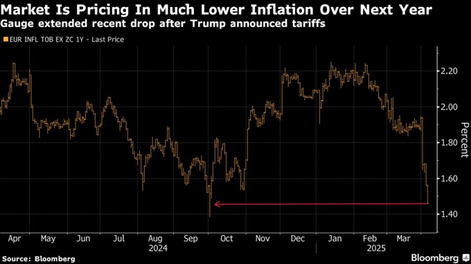 (ブルームバーグ):欧州中央銀行(ECB)に対する利下げ期待が高まっている。投資家やアナリストは、米国のトランプ大統領が発表した相互関税が経済成長に打撃となる一方、物価上昇への影響は緩やかなものになるとみている。