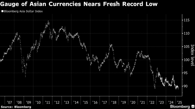 ブルームバーグ・アジア・ドル指数は2006年以降のデータで過去最低水準を記録。韓国のウォンは世界金融危機以来の安値となった。