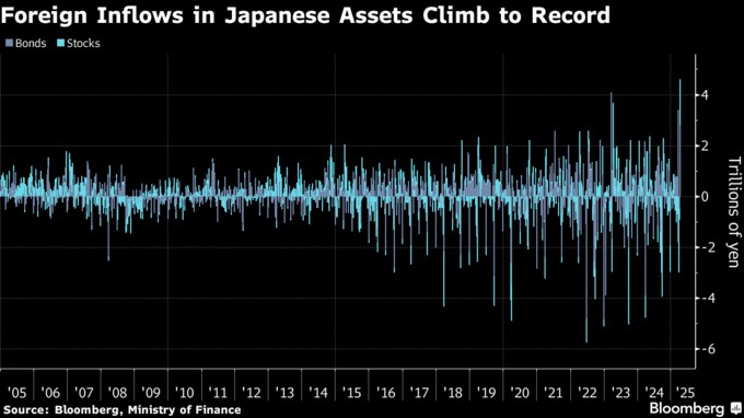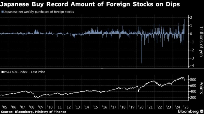 (ブルームバーグ):国内投資家による外国株の買い越しが先週、過去最高に達した。トランプ米大統領の関税政策が市場を揺るがす中、世界的な株価下落と為替の円高が押し目買いを促した可能性がある。