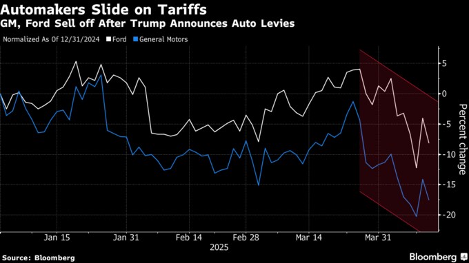 GMの株価は今年に入って10日までに18%下落。フォード株も7.7%下げている。自動車輸入への25%の米追加関税が先週発効すると、業界は直ちに対応に動いた。GMは米国内でのピックアップトラック生産を拡大する計画を発表。フォードは客足が遠のかないよう大幅な値引き販売を開始した。