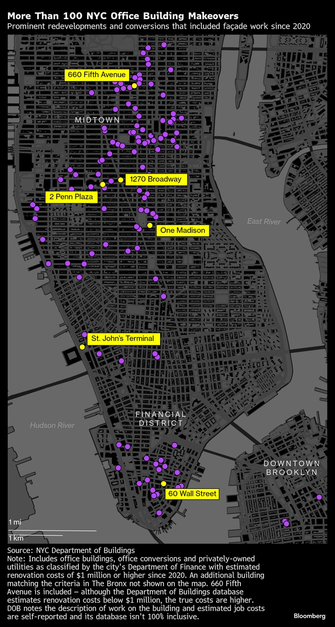 こうした改修は、マンハッタン全体に見られる大きな潮流を反映している。リモートワークの急増で従来型のオフィススペースの需要が低下し、新たな高層ビルを建設する資金の調達も困難になる中、ビルのオーナーは既存建物の改修に多額の投資を行うようになっている。