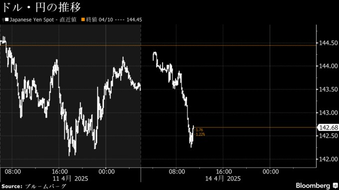 (ブルームバーグ):14日の東京外国為替市場の円相場は、一時1ドル=142円台前半に上昇。トランプ米政権の関税政策に対する懸念が根強く、ブルームバーグ・ドル指数は年初来安値を更新した。関税協議で米国側から為替に関する議論が提起された場合、赤沢亮正経済再生相が応じる考えを示したことも円安是正の思惑から円買いを促している。