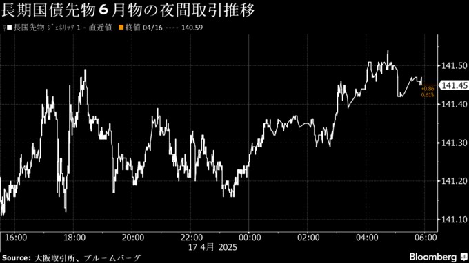 先物夜間取引で6月物は16日の日中取引終値比34銭高の141円45銭で終えた。16日の米10年国債利回りは前日比6ベーシスポイント(bp、1bp=0.01%)低い4.28%程度に低下した。