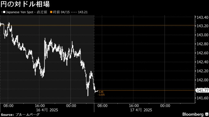 (ブルームバーグ):17日朝の東京外国為替市場の円相場は1ドル=141円台後半と6カ月半ぶりの高値圏。パウエル米連邦準備制度理事会(FRB)議長が貿易摩擦が金融政策に及ぼすリスクに言及し、海外時間に一段とドル売り・円買いが進んだ。日米関税協議に対する警戒感も強く、円高の流れが続きそうだ。