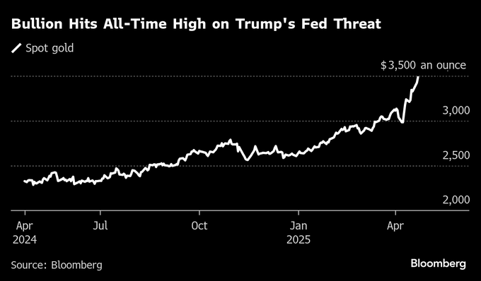 (ブルームバーグ):金価格は22日、1オンス=3500ドルを初めて突破した。トランプ米大統領がパウエル連邦準制度理事会(FRB)議長解任に踏み切るのではないかとの懸念を受け、米国の株式や国債、ドルから資金が引き揚げられる中で金が買われている。