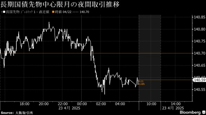 先物夜間取引で6月物は22日の日中取引終値比11銭安の140円59銭で終えた。22日の米10年国債利回りは前日比約1ベーシスポイント(bp、1bp=0.01%)低い4.4%程度に低下した。