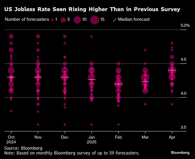 労働市場は当面は総じて持ちこたえるとみられており、エコノミストは雇用者数の増加を今年が月平均7万2000人、来年が同10万人と予想している。失業率は25年末までに4.6%への上昇が見込まれており、3月時点での予想4.3%から引き上げられた。