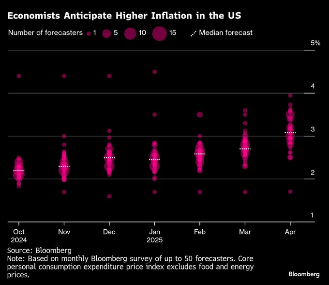 米金融当局が重視するインフレ指標である個人消費支出(PCE)価格指数について、エコノミストは25年末に3.2%に達すると予想。3月時点での予想は2.7%だった。食品とエネルギーを除いたコアPCE価格指数は3.3%に達すると予想されている。