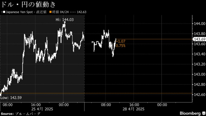 円相場は25日の海外市場で一時144円03銭と、14日以来の水準まで下落した。中国政府が米国からの一部輸入品を125%の関税対象から除外することを検討しているとのブルームバーグ報道を受け、米中摩擦緩和への期待が高まった。日米間での円安・ドル高是正を巡る思惑がいったん後退したことも円売りにつながった。