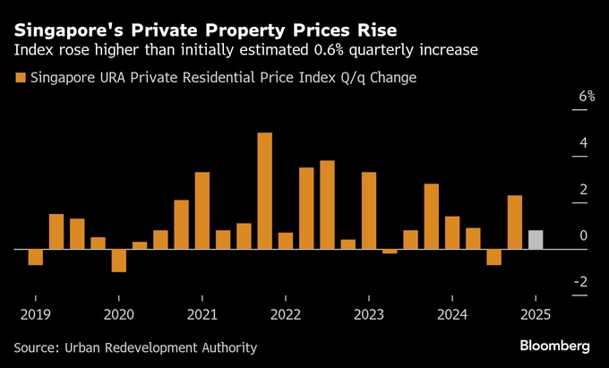 (ブルームバーグ):シンガポールの民間住宅は1-3月期にこれまでの発表よりも大きく値上がりした。経済への逆風にもかかわらず、需要が続いていることが都市再開発庁(URA)が25日発表した改定値で示された。