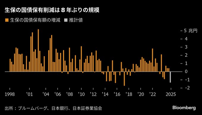 日銀の利上げ継続による金利先高観から生保は24年度に待ちの状態を続けた。日銀と日本証券業協会のデータを分析したブルームバーグの推計によると、金利が上昇基調にあった1-3月は売り手に転じ、国債保有を1兆3500億円削減した。削減額は過去3番目の大きさだ。