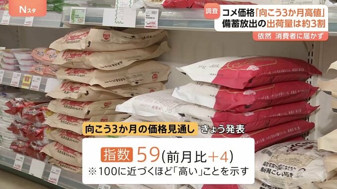 備蓄米が市場に出ても、なお高値は続きそうです。「向こう3か月」のコメ価格の見通しを示す指数が前の月より4ポイント上昇しました。コメの卸売業者などでつくる団体は毎月、全国の生産者や集荷業者などにコメ価格…