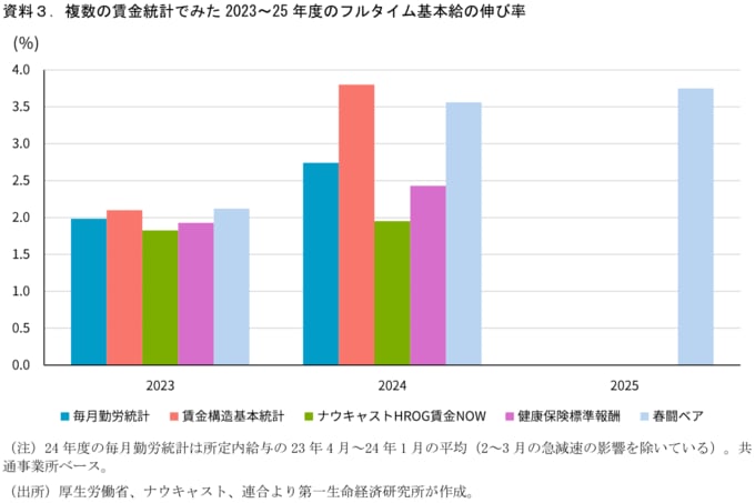 毎月勤労統計、賃金構造基本統計調査、ナウキャストの公表するHrog賃金Now(求人データを用いた募集賃金)、健康保険の標準報酬、連合調査における春闘ベースアップ率の5つの賃金統計におけるフルタイム労働者の基本給について、23年度、24年度の伸び率を比較する。