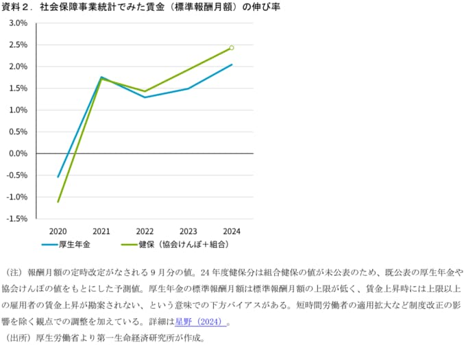 まず、紹介したいのはEconomic Trends「社会保障事業統計による賃金把握の課題~標準報酬上限をはじめ様々なクセに留意する必要~」(2024年6月4日)で紹介した社会保障統計を用いた賃金動向の分析だ。
