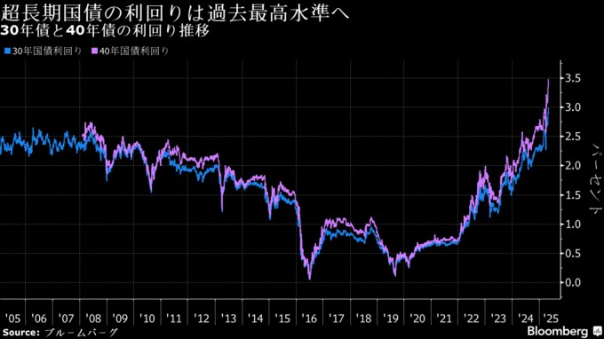 海外市場でも国債利回りは上昇しているが、日本の変化が目立っており、10年債と30年債の利回り格差は4月以降に約50ベーシスポイント(bp、1bp=0.01%)拡大。これは米国やドイツ、英国を大きく上回り、日本の10年債利回りは中国債を上回る可能性も出ている。30年債利回りは16日に一時2.985%と過去最高の3.03%に接近し、40年債は15日に3.47%と最高水準を更新した。