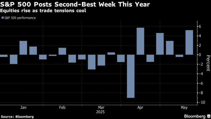(ブルームバーグ):16日の米株式相場は上昇。S&P500種株価指数は5日続伸となった。この日発表された米消費者センチメントは弱かったが、トランプ米大統領の関税戦争が沈静化しつつあるとの期待から、同指数は週間で今年2番目の大幅高を記録した。