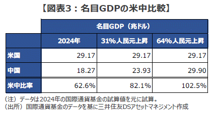 しかし、プラザ合意と同様なインパクトのドル安が対人民元で発生すると、1年後に中国のGDPは米国の約82%に、そして2年3カ月後には米国の約103%に達し、米中の名目GDPは逆転することとなります。