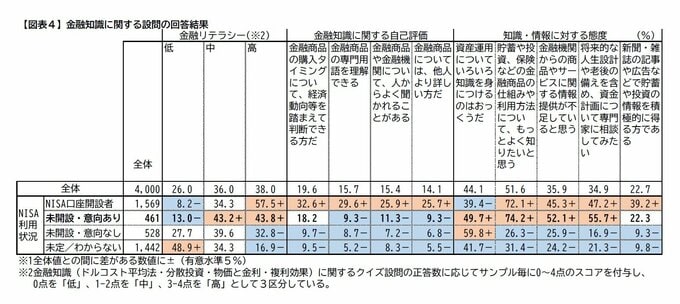 まず金融知識に関するクイズ設問の正答数から分類した[金融リテラシー]をみると、NISA意向者(図表内「未開設・意向あり」層)では金融リテラシー「中」(43.2%)、「高」(43.8%)が高く「低」(13.0%)が低くなっており、NISA意向者が金融リテラシーの比較的高いグループであることがわかる。