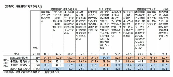 次に、同じく弊所が実施した調査における[資産運用に関する考え方]の回答結果をみると、NISA意向者で「資産運用について関心がある」(71.6%)や「よい商品・サービスがあればこれまで取引経験のない金融機関でも取引を考えたい」(50.1%)がNISA利用者と同程度に高く、NISAへの意向が資産運用への関心の高さに裏付けられていることが改めて確認できる。
