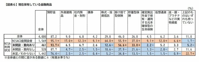 現在保有している金融商品をNISAの利用状況別にみると、NISA利用者ですべての金融商品が高いところ、NISA意向者では「掛け捨て型保険」(56.6%)及び「貯蓄型保険」(33.0%)がNISA利用者と同程度に高くなっている。