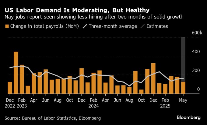 ブルームバーグのエコノミスト調査の中央値によると、非農業部門雇用者数は12万5000人増と予想されており、3月と4月の予想を上回る伸びからは鈍化する見通し。ただ、過去3カ月の平均では16万2000人増と堅調なペースを維持することになる。失業率は4.2%で横ばいと予想されている。