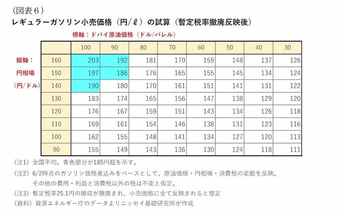 そこで、最近の状況を基に、原油価格(ドバイ原油・ドル建て)とドル円レートの組み合わせごとに、25.1円の暫定税率廃止を反映したガソリン価格を試算した。