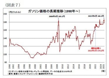 暫定税率の廃止時期については見通しが立っておらず、今後の政局の行方次第の面もあるが、ここでは、今年年末の税制改正で廃止が正式に決まって26年度から段階的に廃止され、来年の夏に完全に廃止されると想定する。筆者の中心的な見通しでは、26年夏のドバイ原油価格は1バレル62ドル、ドル円レートは137円を見込んでいる。その場合のガソリン価格は1リットル151円へと大きく下がることになる。