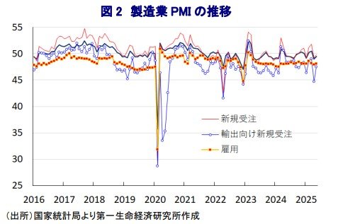 そして、当局が推進する設備更新支援を受けて省力化投資が活発化しており、生産拡大にもかかわらず「雇用(48.1)」は前月比+0.2pt とわずかな上昇に留まるなど、雇用が増えにくい状況にある。こうした事情も個人消費が伸び悩む一因になっている。