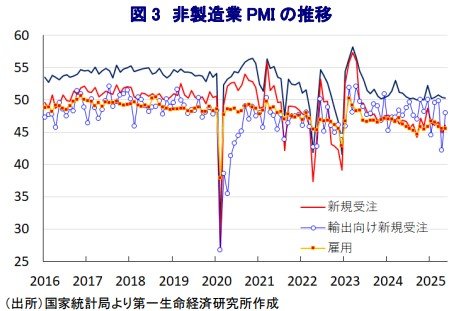 その一方、先行きの生産活動に影響を与える「新規受注(49.8)」は前月比+0.6pt 上昇するも2ヶ月連続で50を下回る水準に留まるほか、「輸出向け新規受注(47.5)」も同+2.8pt上昇するも引き続き 50 を大幅に下回るなど、受注動向の回復は道半ばの状況にある。