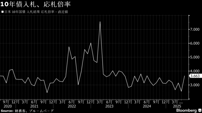 (ブルームバーグ):財務省が3日に実施した10年国債の入札は堅調な需要を集め、長期金利の指標となる10年債利回りは低下した。ただ、今週は需要動向に不透明感が残る30年国債の入札を5日に控えており、中期債の上昇は限定的にとどまった。